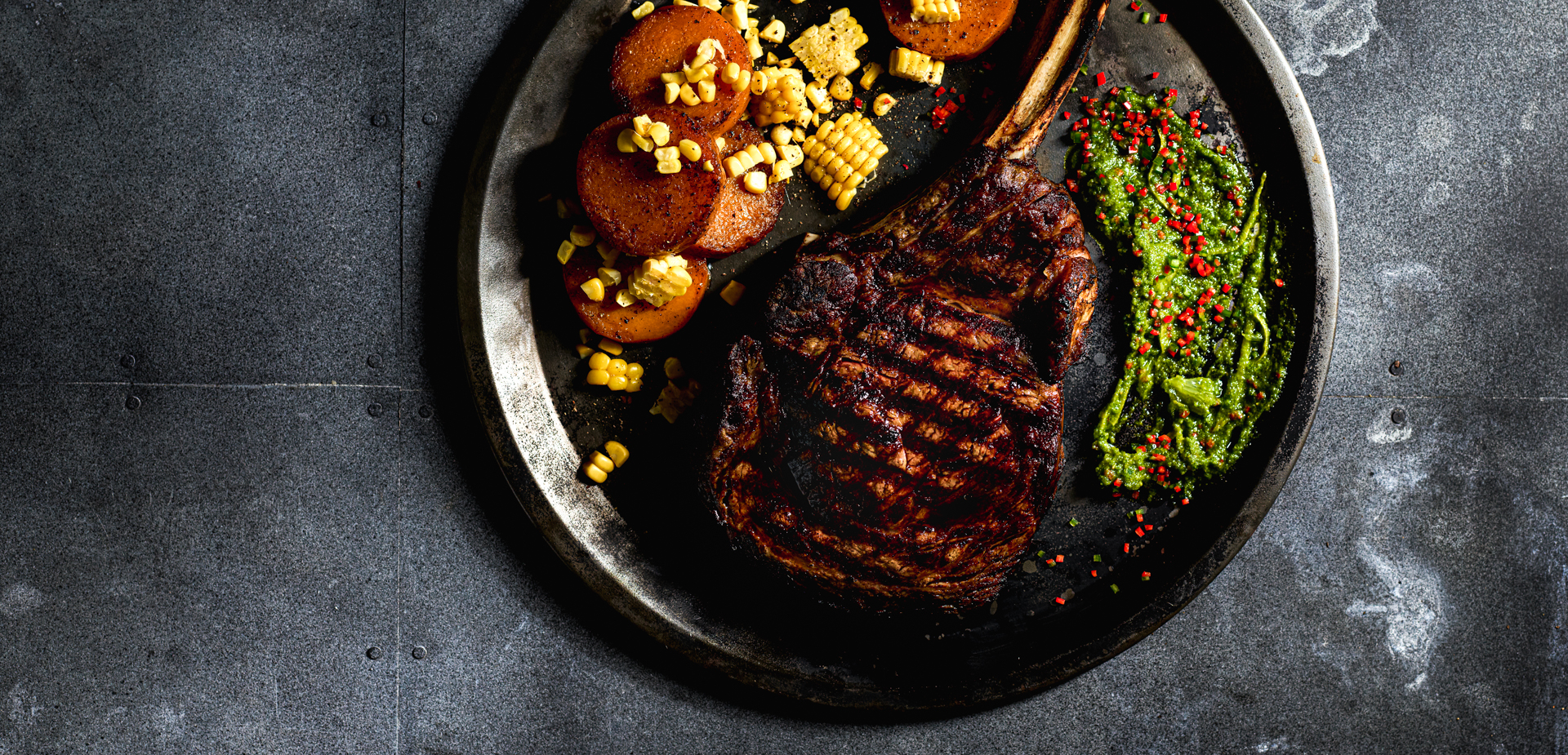 Tomahawk with sweet potato-corn salad and chimichurri. This baby will command your attention. It won’t fit in a pan, so it’s grill all the way.